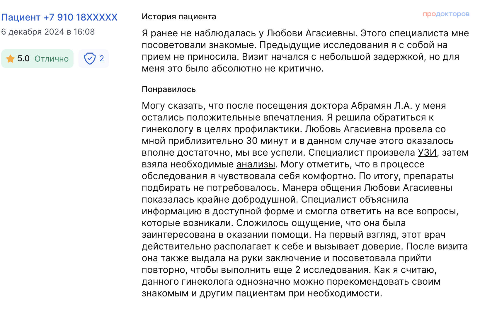 Затем проводится осмотр на гинекологическом кресле, при необходимости — УЗИ и забор анализов. После обследования врач объясняет результаты, ставит диагноз и подбирает лечение или профилактику, даёт рекомендации по уходу и контролю женского здоровья.